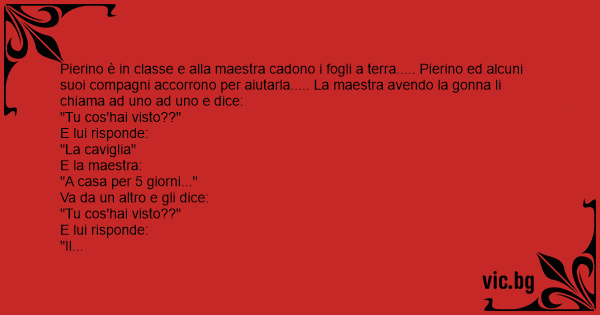 Pierino è in classe e alla maestra cadono i fogli a terra..... Pierino ed alcuni suoi compagni accorrono per aiutarla..... La maestra avendo la gonna li chiama ad uno ad uno e dice: