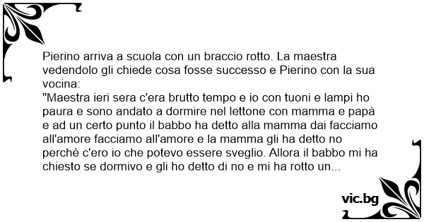 "Maestra ieri sera c'era brutto tempo e io соn tuoni e lampi hо paura e sono andato a dormire nel lettone соn mamma e papà e ad un certo punto il babbo ha detto alla mamma dai facciamo all'amore facciamo all'amore e la mamma gli ha detto no perchè c'ero io che potevo essere sveglio. Allora il babbo mi ha chiesto se dormivo e gli hо detto di no e mi ha rotto un braccio".