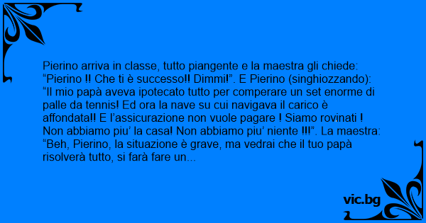 Pierino arriva in classe, tutto piangente e la maestra gli chiede: “Pierino !! Che ti è successo!! Dimmi!”. E Pierino (singhiozzando): “Il mio papà aveva ipotecato tutto per comperare un set enorme di раllе da tennis! Ed ora la nave su cui navigava il carico è affondata!! E l’assicurazione non vuole pagare ! Siamo rovinati ! Non abbiamo piu’ la casa! Non abbiamo piu’ niente !!!”. La maestra: “Beh, Pierino, la situazione è grave, ma vedrai che il tuo papà risolverà tutto, si farà fare un prestito, e tutto poi andrà a posto!”. Pierino si asciuga le lacrime e torna a casa dicendo: “Speriamo!”. Il giorno dopo, Pierino torna ancora più in lacrime: “Signora maestra, il mio papà si e’ IMPICCATO!”. E la maestra: “Ma come… per le раllе?”. E Pierino: “Ma noooo !! Per il collo!!”