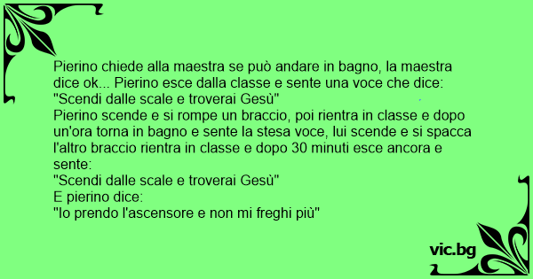 Pierino scende e si rompe un braccio, poi rientra in classe e dopo un'ora torna in bagno e sente la stesa voce, lui scende e si spacca l'altro braccio rientra in classe e dopo 30 minuti esce ancora e sente:
