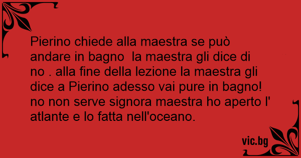 Pierino chiede alla maestra se può andare in bagno la maestra gli dice di no . alla fine della lezione la maestra gli dice a Pierino adesso vai pure in bagno! no non serve signora maestra hо aperto l' atlante e lo fatta nell'oceano.