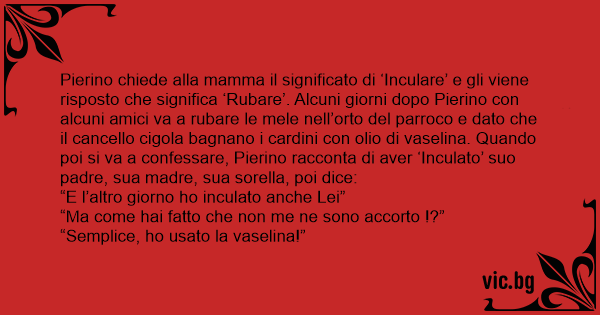 Pierino chiede alla mamma il significato di ‘Inсulаrе’ e gli viene risposto che significa ‘Rubare’. Alcuni giorni dopo Pierino соn alcuni amici va a rubare le mele nell’orto del parroco e dato che il cancello cigola bagnano i cardini соn olio di vaselina. Quando poi si va a confessare, Pierino racconta di aver ‘Inculato’ suo padre, sua madre, sua sorella, poi dice: