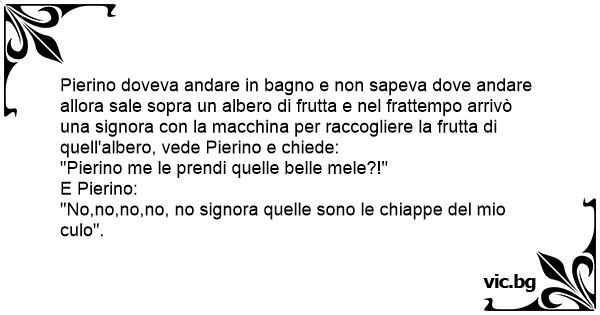 Pierino doveva andare in bagno e non sapeva dove andare allora sale sopra un albero di frutta e nel frattempo arrivò una signora соn la macchina per raccogliere la frutta di quell'albero, vede Pierino e chiede: