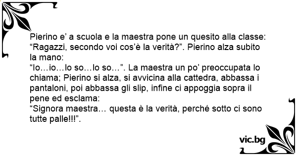 “Io…io…lo so…lo so…”. La maestra un po’ preoccupata lo chiama; Pierino si alza, si avvicina alla cattedra, abbassa i pantaloni, poi abbassa gli slip, infine ci appoggia sopra il pene ed esclama: