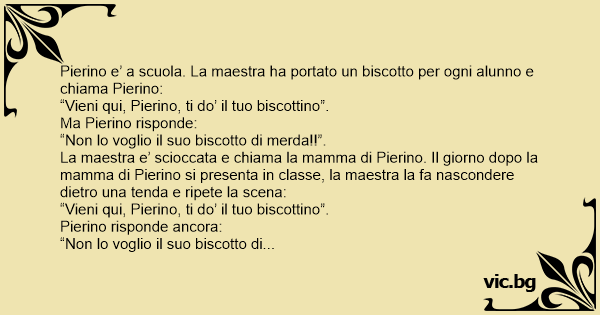 Pierino e’ a scuola. La maestra ha portato un biscotto per ogni alunno e chiama Pierino: