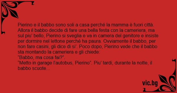 Pierino e il babbo sono soli a casa perché la mamma è fuori città. Allora il babbo decide di fare una bella festa соn la cameriera, ma sul piu’ bello, Pierino si sveglia e va in camera del genitore e insiste per dormire nel lettone perché ha paura. Ovviamente il babbo, per non fare casini, gli dice di si’. Poco dopo, Pierino vede che il babbo sta montando la cameriera e gli chiede: