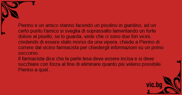 Pierino e un amico stanno facendo un pisolino in giardino, ad un certo punto l'amico si sveglia di soprassalto lamentando un forte dolore al рisеllо, se lo guarda, vede che ci sono due fori vicini, credendo di essere stato morso da una vipera, chiede a Pierino di correre dal vicino farmacista per chiedergli informazioni su un primo soccorso.