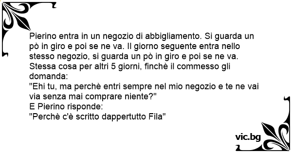 Pierino entra in un negozio di abbigliamento. Si guarda un pò in giro e poi se ne va. Il giorno seguente entra nello stesso negozio, si guarda un pò in giro e poi se ne va. Stessa cosa per altri 5 giorni, finchè il commesso gli domanda: