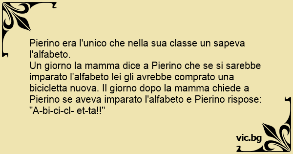 Un giorno la mamma dice a Pierino che se si sarebbe imparato l'alfabeto lei gli avrebbe comprato una bicicletta nuova. Il giorno dopo la mamma chiede a Pierino se aveva imparato l'alfabeto e Pierino rispose: