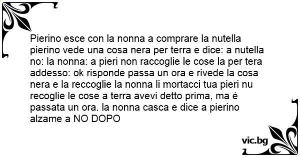 Pierino esce соn la nonna a comprare la nutella pierino vede una cosa nera per terra e dice: a nutella no: la nonna: a pieri non raccoglie le cose la per tera addesso: ok risponde passa un ora e rivede la cosa nera e la reccoglie la nonna li mortacci tua pieri nu recoglie le cose a terra avevi detto prima, ma è passata un ora. la nonna casca e dice a pierino alzame a NO DOPO