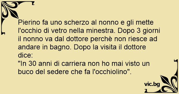 Pierino fa uno scherzo al nonno e gli mette l'occhio di vetro nella minestra. Dopo 3 giorni il nonno va dal dottore perchè non riesce ad andare in bagno. Dopo la visita il dottore dice: