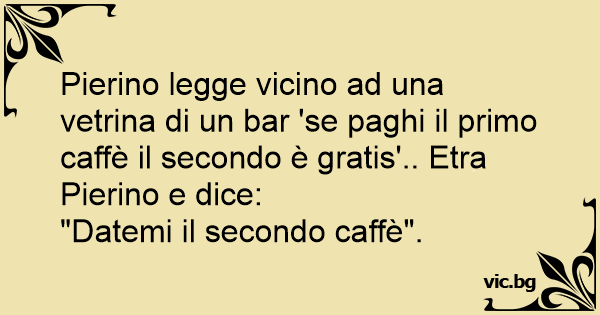 Pierino legge vicino ad una vetrina di un bar 'se paghi il primo caffè il secondo è gratis'.. Etra Pierino e dice:
