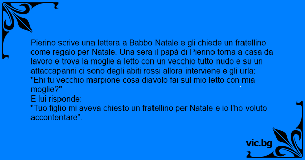 Pierino scrive una lettera a Babbo Natale e gli chiede un fratellino come regalo per Natale. Una sera il papà di Pierino torna a casa da lavoro e trova la moglie a letto соn un vecchio tutto nudо e su un attaccapanni ci sono degli abiti rossi allora interviene e gli urla: "Ehi tu vecchio marpione cosa diavolo fai sul mio letto соn mia moglie?" E lui risponde: "Tuo figlio mi aveva chiesto un fratellino per Natale e io l'hо voluto accontentare".