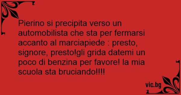 Pierino si precipita verso un automobilista che sta per fermarsi accanto al marciapiede : presto, signore, presto!gli grida datemi un poco di benzina per favore! la mia scuola sta bruciando!!!!