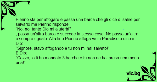 ; passa un'altra barca e succede la stessa cosa. Ne passa un'altra e sempre uguale. Alla fine Pierino affoga va in Paradiso e dice a Dio: