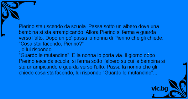 "Guardo le mutandine". E la nonna lo porta via. Il giorno dopo Pierino esce da scuola, si ferma sotto l'albero su cui la bambina si sta arrampicando e guarda verso l'alto. Passa la nonna che gli chiede cosa sta facendo, lui risponde "Guardo le mutandine" e la nonna lo riporta a casa. Il terzo giorno Pierino esce da scuola, si ferma sotto l'albero dove sempre la stessa bambina si sta arrampicando e guarda verso l'alto. Arriva come al solito la nonna che gli chiede "Cosa stai facendo, Pierino?"