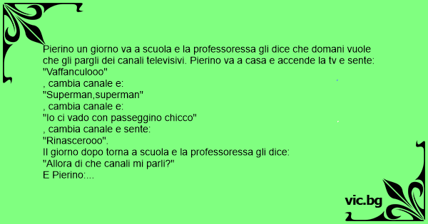 Pierino un giorno va a scuola e la professoressa gli dice che domani vuole che gli pargli dei canali televisivi. Pierino va a casa e accende la tv e sente: