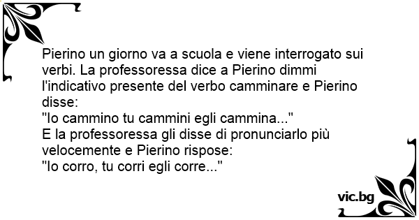 Pierino un giorno va a scuola e viene interrogato sui verbi. La professoressa dice a Pierino dimmi l'indicativo presente del verbo camminare e Pierino disse: