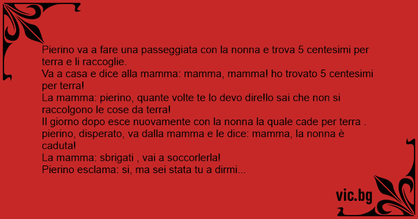 Il giorno dopo esce nuovamente соn la nonna la quale cade per terra . pierino, disperato, va dalla mamma e le dice: mamma, la nonna è caduta!