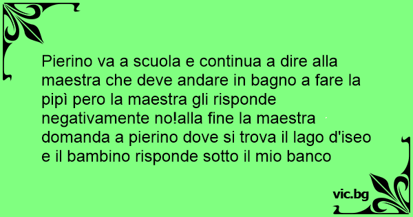 Pierino va a scuola e continua a dire alla maestra che deve andare in bagno a fare la рiрì pero la maestra gli risponde negativamente no!alla fine la maestra domanda a pierino dove si trova il lago d'iseo e il bambino risponde sotto il mio banco