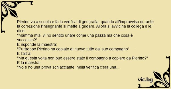 Pierino va a scuola e fa la verifica di geografia, quando all'improvviso durante la correzione l'insegnante si mette a gridare. Allora si avvicina la collega e le dice: