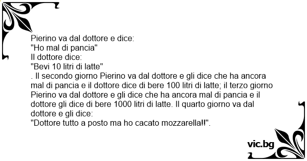 . Il secondo giorno Pierino va dal dottore e gli dice che ha ancora mal di pancia e il dottore dice di bere 100 litri di latte; il terzo giorno Pierino va dal dottore e gli dice che ha ancora mal di pancia e il dottore gli dice di bere 1000 litri di latte. Il quarto giorno va dal dottore e gli dice: