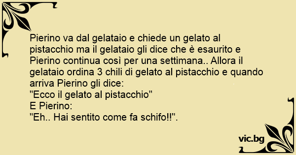 Pierino va dal gelataio e chiede un gelato al pistacchio ma il gelataio gli dice che è esaurito e Pierino continua così per una settimana.. Allora il gelataio ordina 3 chili di gelato al pistacchio e quando arriva Pierino gli dice:
