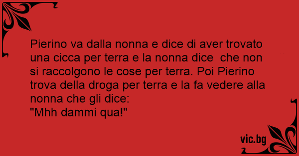 Pierino va dalla nonna e dice di aver trovato una cicca per terra e la nonna dice che non si raccolgono le cose per terra. Poi Pierino trova della droga per terra e la fa vedere alla nonna che gli dice:
