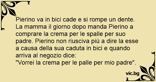 Pierino va in bici cade e si rompe un dente. La mamma il giorno dopo manda Pierino a comprare la crema per le spalle per suo padre. Pierino non riusciva più a dire la esse a causa della sua caduta in bici e quando arriva al negozio dice: