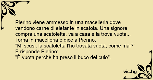 Pierino viene ammesso in una macelleria dove vendono carne di elefante in scatola. Una signore compra una scatoletta, va a casa e la trova vuota... Torna in macelleria e dice a Pierino: