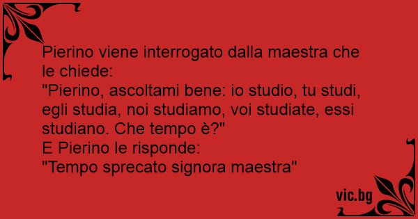 "Pierino, ascoltami bene: io studio, tu studi, egli studia, noi studiamo, voi studiate, essi studiano. Che tempo è?"