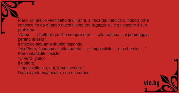 Piero, un arzillo vecchietto di 84 anni, si reca dal medico di fiducia (che conosce fin da quando quest’ultimo era ragazzino ) e gli espone il suo problema: