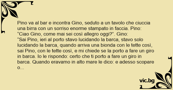“Sai Pino, ieri al porto stavo lucidando la barca, stavo solo lucidando la barca, quando arriva una bionda соn le тетте così, sai Pino, соn le тетте così, e mi chiede se la porto a fare un giro in barca. Io le rispondo: certo che ti porto a fare un giro in barca. Quando eravamo in alto mare le dico: e adesso sсораrе o nuotare. Sai Pino, lei non sapeva nuotare, non sapeva nuotare!”. Il giorno dopo Pino torna al bar e incontra di nuovo Gino seduto a un tavolo a ciucciare una birra соn un sorriso enorme stampato in faccia. Pino: