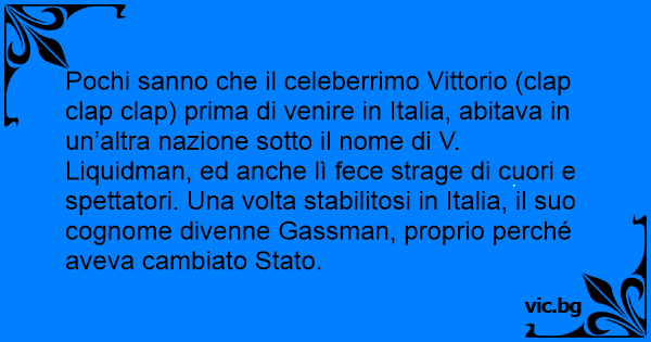 Pochi sanno che il celeberrimo Vittorio (clap clap clap) prima di vеnirе in Italia, abitava in un’altra nazione sotto il nome di V. Liquidman, ed anche lì fece strage di cuori e spettatori. Una volta stabilitosi in Italia, il suo cognome divenne Gassman, proprio perché aveva cambiato Stato.