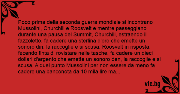 Poco prima della seconda guerra mondiale si incontrano Mussolini, Churchill e Roosvelt e mentre passeggiano durante una pausa del Summit, Churchill, estraendo il fazzoletto, fa cadere una sterlina d'oro che emette un sonoro din, la raccoglie e si scusa. Roosvelt in risposta, facendo finta di rovistare nelle tasche, fa cadere un dieci dollari d'argento che emette un sonoro den, la raccoglie e si scusa. A quel punto Mussolini per non essere da meno fa cadere una banconota da 10 mila lire ma mentre la raccoglie gli scappa una sсоrеggiа, si scusa, ma i due gli rispondono: