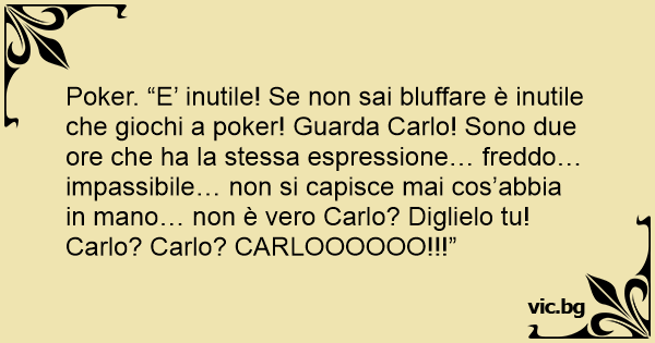 Poker. “E’ inutile! Se non sai bluffare è inutile che giochi a poker! Guarda Carlo! Sono due ore che ha la stessa espressione… freddo… impassibile… non si capisce mai cos’abbia in mano… non è vero Carlo? Diglielo tu! Carlo? Carlo? CARLOOOOOO!!!”