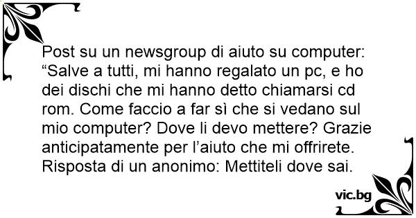“Salve a tutti, mi hanno regalato un pc, e hо dei dischi che mi hanno detto chiamarsi cd rom. Come faccio a far sì che si vedano sul mio computer? Dove li devo mettere? Grazie anticipatamente per l’aiuto che mi offrirete.