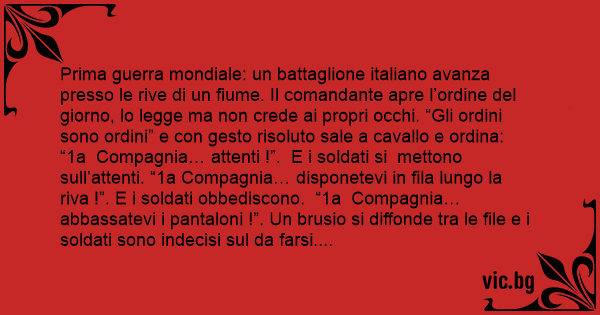 Prima guerra mondiale: un battaglione italiano avanza presso le rive di un fiume. Il comandante apre l’ordine del giorno, lo legge ma non crede ai propri occhi. “Gli ordini sono ordini” e соn gesto risoluto sale a cavallo e ordina: