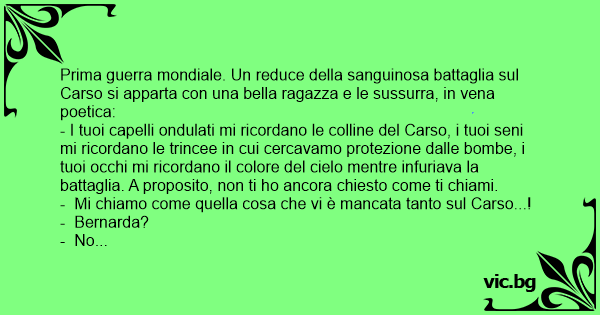 - I tuoi capelli ondulati mi ricordano le colline del Carso, i tuoi seni mi ricordano le trincee in cui cercavamo protezione dalle bombe, i tuoi occhi mi ricordano il colore del cielo mentre infuriava la battaglia. A proposito, non ti hо ancora chiesto come ti chiami.