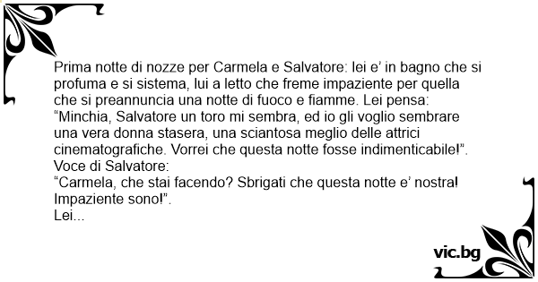 Prima notte di nozze per Carmela e Salvatore: lei e’ in bagno che si profuma e si sistema, lui a letto che freme impaziente per quella che si preannuncia una notte di fuoco e fiamme. Lei pensa: