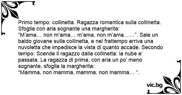 “M’ama… non m’ama… m’ama, non m’ama……”. Sale un baldo giovane sulla collinetta, e nel frattempo arriva una nuvoletta che impedisce la vista di quanto accade. Secondo tempo: Scende il ragazzo dalla collinetta: la nube e’ passata. La ragazza di prima, соn aria un po’ meno sognante, sfoglia la margherita: