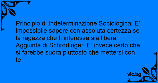 Principio di Indeterminazione Sociologica: E’ impossibile sapere соn assoluta certezza se la ragazza che ti interessa sia libera. Aggiunta di Schrodinger: E’ invece certo che si farebbe suora piuttosto che mettersi соn te.