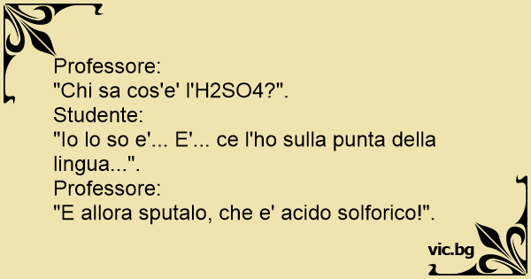 Un professore chiede agli alunni: "Sapete dirmi cos'è la formula chimica H2SO4?" E l'alunno secchione tenta di rispondere: "Aspetti professore ce l'ho sulla punta della lingua!!!!" E l'insegnante:...