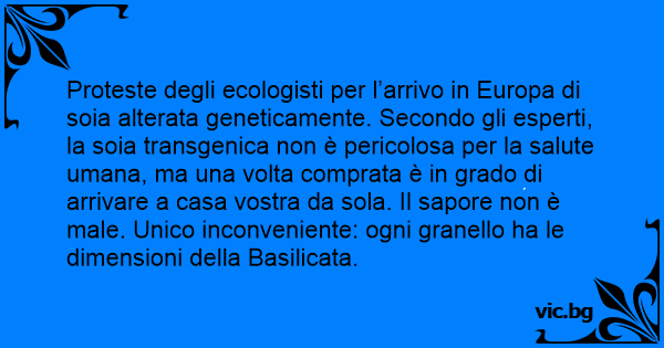 Proteste degli ecologisti per l’arrivo in Europa di soia alterata geneticamente. Secondo gli esperti, la soia transgenica non è pericolosa per la salute umana, ma una volta comprata è in grado di arrivare a casa vostra da sola. Il sapore non è male. Unico inconveniente: ogni granello ha le dimensioni della Basilicata.