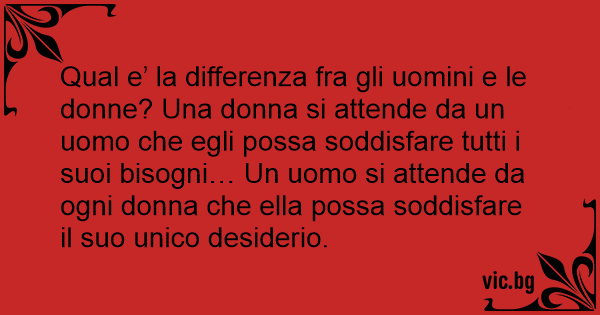 Qual e’ la differenza fra gli uomini e le donne? Una donna si attende da un uomo che egli possa soddisfare tutti i suoi bisogni… Un uomo si attende da ogni donna che ella possa soddisfare il suo unico desiderio.