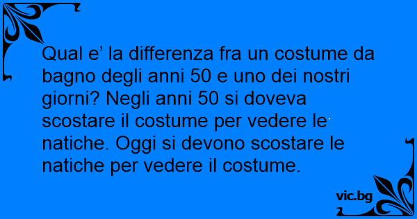 Qual e’ la differenza fra un costume da bagno degli anni 50 e uno dei nostri giorni? Negli anni 50 si doveva scostare il costume per vedere le natiche. Oggi si devono scostare le natiche per vedere il costume.