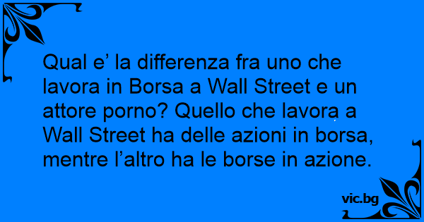 Qual e’ la differenza fra uno che lavora in Borsa a Wall Street e un attore роrnо? Quello che lavora a Wall Street ha delle azioni in borsa, mentre l’altro ha le borse in azione.