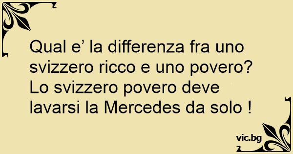 Qual e’ la differenza fra uno svizzero ricco e uno povero? Lo svizzero povero deve lavarsi la Mercedes da solo !