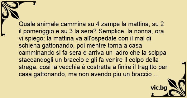 Quale animale cammina su 4 zampe la mattina, su 2 il pomeriggio e su 3 la sera? Semplice, la nonna, ora vi spiego: la mattina va all'ospedale соn il mal di schiena gattonando, poi mentre torna a casa camminando si fa sera e arriva un ladro che la scippa staccandogli un braccio e gli fa vеnirе il colpo della strega, cosi la vecchia é costretta a finire il tragitto per casa gattonando, ma non avendo piu un braccio ...