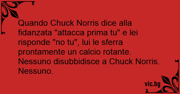 Quando Chuck Norris dice alla fidanzata "attacca prima tu" e lei risponde "no tu", lui le sferra prontamente un calcio rotante. Nessuno disubbidisce a Chuck Norris. Nessuno.